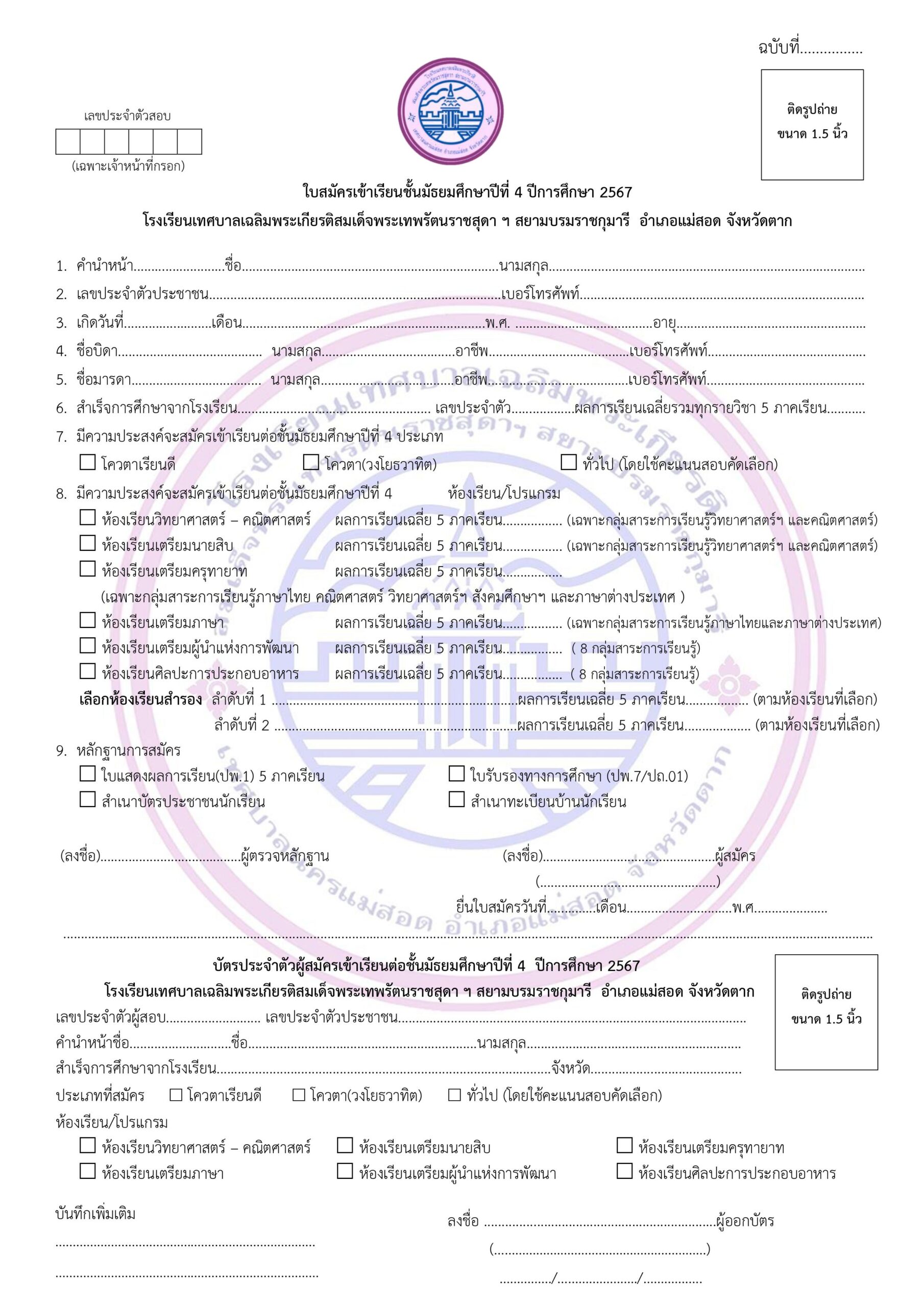 ใบสมัครเรียน มัธยมศึกษาปีที่ 4 ปีการศึกษา 2569
