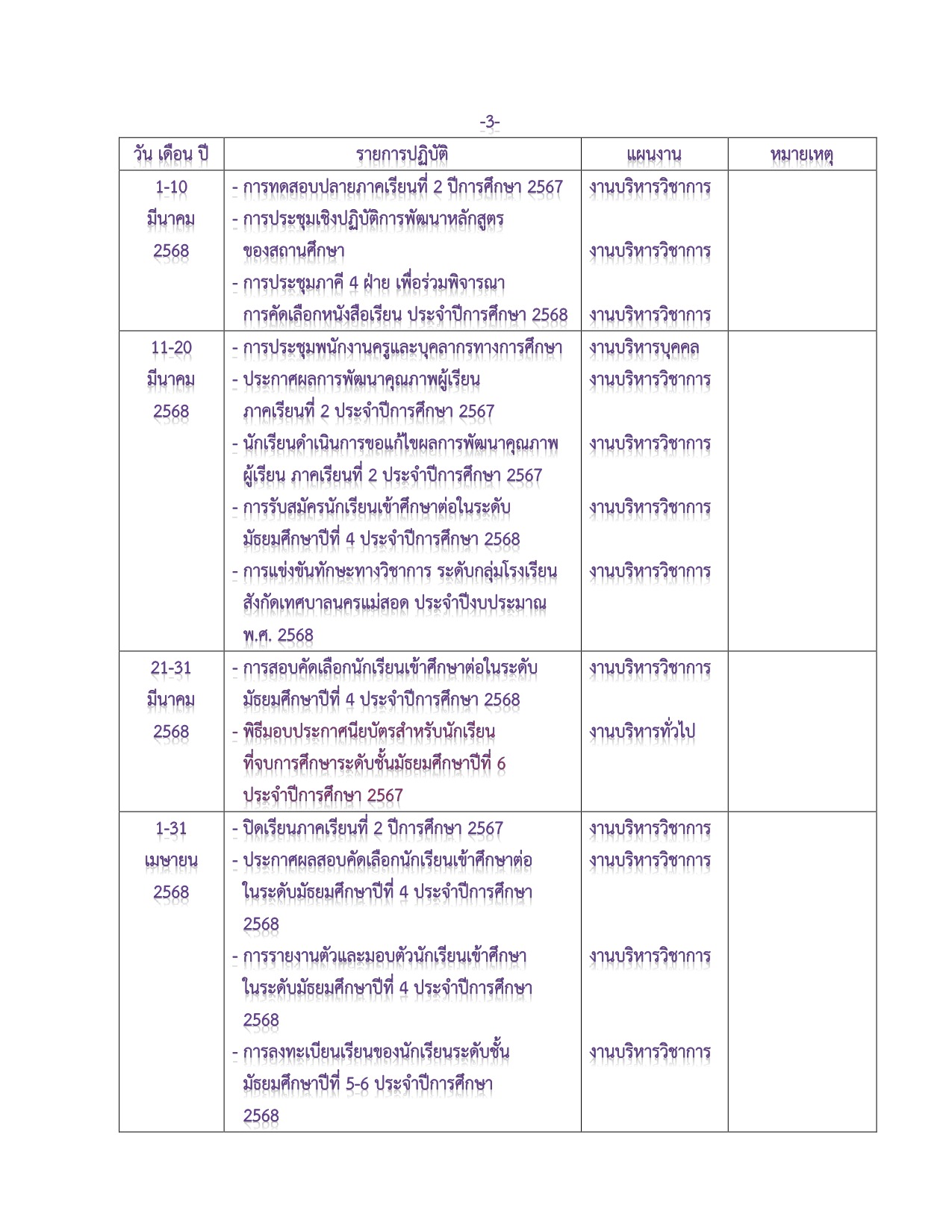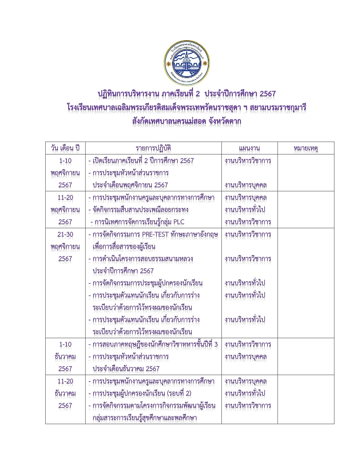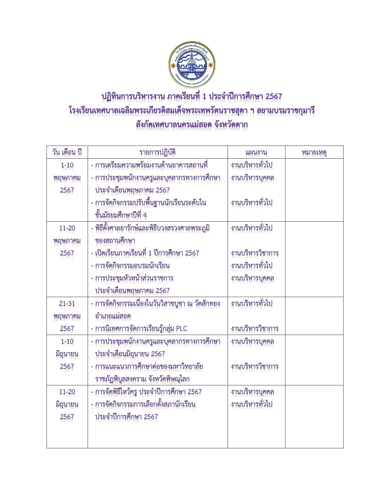 ปฏิทินการบริหารงาน ประจำปีการศึกษา 2567