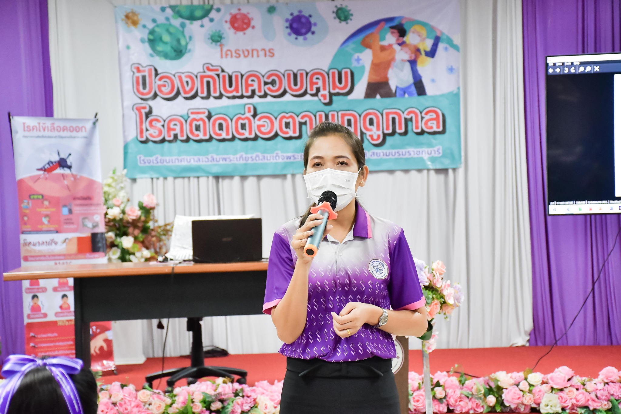 การป้องกันควบคุมโรคติดต่อตามฤดูกาลในสถานศึกษานางสาวนิภาภรณ์ อินนาคกูล ผู้อำนวยการสถานศึกษา มอบหมายให้นางสาวณัฐชนา อยู่เจริญ หัวหน้างานอนามัยโรงเรียน เป็นประธานในการจัดกิจกรรมโครงการการป้องกันควบคุมโรคติดต่อตามฤดูกาลร่วมกับคลินิกอบอุ่นเทศบาลนครแม่สอด ให้ความรู้กับบุคลากรทางการศึกษา นักเรียน จำนวน 160 คน ณ ห้องม่วงเทพนคร นางสาวปัทมพร ใจยาเก๋ ตำแหน่ง นักวิชาการสาธรณสุขชำนาญการ กล่าวว่า ปัญหาโรคติดต่อเป็นปัญหาที่สำคัญการเปลี่ยนแปลงของสภาพอากาศและสิ่งแวดล้อมเป็นสาเหตุที่ทำให้เกิดโรคติดต่อหลายชนิด เนื่องจากเชื้อโรคจะมีชีวิตอยู่ในสิ่งแวดล้อมได้นานขึ้นเจริญเติบโตได้รวดเร็ว สามารถแพร่ระบาดได้ง่ายและเร็ว เช่น โรคติดต่อทางระบบหายใจ(ไข้หวัดใหญ่ โควิด-19) โรคติดต่อที่มียุงเป็นพาหะ(ไข้เลือดออก) โรคติดต่อทางอาหารและน้ำ(อุจจาระร่วง) และโรคติดต่ออื่น ๆ (มือ เท้า ปาก,ทางเดินหายใจ ฉี่หนู) โดยนักเรียน และบุคลากรทางการศึกษาจะต้องทราบถึงสาเหตุและแนวทางป้องกันโรคที่เกิดขึ้นในพื้นที่ เพื่อให้ระมัดระวังและป้องกันปัจจัยเสี่ยงต่อโรค โดยเฉพาะในกลุ่มเด็กเล็ก ผู้สูงอายุ ผู้ที่มีโรคประจำตัว และผู้ป่วยโรคเรื้อรัง การดำเนินงานเฝ้าระวังป้องกันควบคุมโรคและภัยสุขภาพของนักเรียน และบุคลากรทางการศึกษา ในพื้นที่จะต้อง รวดเร็ว ทันเหตุการณ์จึงจะมีประสิทธิภาพและประสิทธิผลต่อสุขภาพ ภายใต้การมีส่วนร่วมจากภาคท้องถิ่น และภาคประชาชน วางแผนป้องกันควบคุมโรคและภัยสุขภาพในพื้นที่ โดยการดำเนินงานในลักษณะ “ร่วมคิด ร่วมวางแผนร่วมดำเนินการร่วมประเมินผล และร่วมรับผิดชอบ” ในทุกระดับเพื่อช่วยกันค้นหาปัญหา จึงจะสามารถแก้ไขต้นตอของปัญหาการเกิดโรค นักเรียนและบุคลากรทางการศึกษา จะต้องดำเนินการแก้ไขปัญหาที่สอดคล้องกับบริบทและสภาพปัญหาของแต่ละพื้นที่ภายใต้ศักยภาพพื้นที่ของตนเอง หน่วยงานที่เกี่ยวข้องทุกระดับให้ความสำคัญกับปัญหาสุขภาพที่แท้จริงของพื้นที่เป็นหลัก สามารถเชื่อมโยงผสมผสานแนวคิด องค์ความรู้เข้ากับบริบทของพื้นที่ จึงจะทำให้เกิดการมีส่วนร่วมในการบริหารจัดการในระดับพื้นที่อย่างต่อเนื่องและยั่งยืนต่อไปในอนาคต โรงเรียนเทศบาลเฉลิมพระเกียรติสมเด็จพระเทพรัตนราชสุดา ฯ สยามบรมราชกุมารี จึงได้จัดทำโครงการป้องกันควบคุมโรคติดต่อตามฤดูกาลขึ้น เพื่อส่งเสริมนักเรียน และบุคลากรทางการศึกษาสามารถป้องกันตนเองไม่ให้ป่วยด้วยโรคติดต่อที่ป้องกันได้ เพื่อพัฒนาศักยภาพ ทักษะส่วนบุคคลและชุมชน ให้เกิดค
