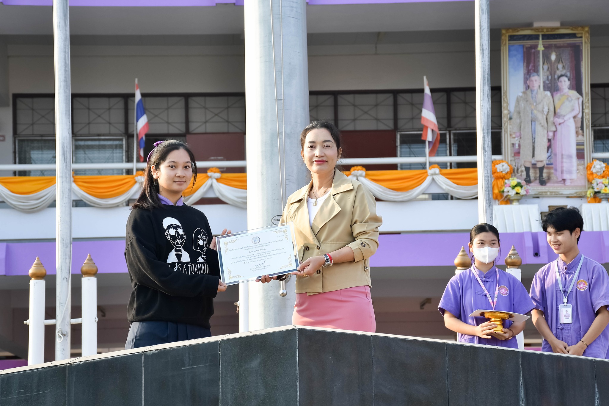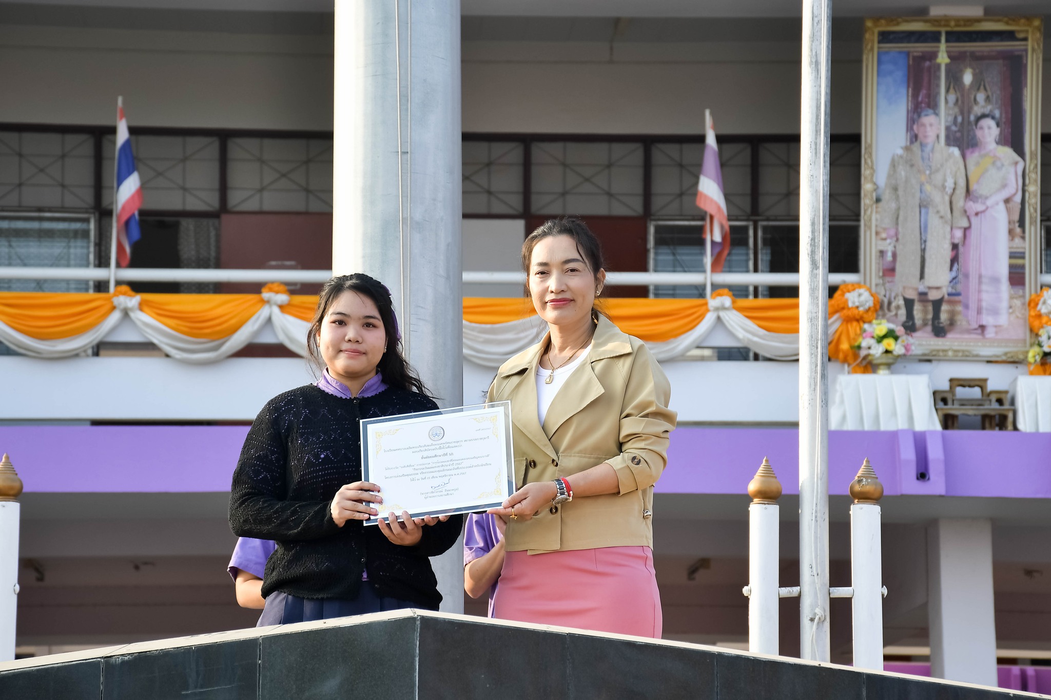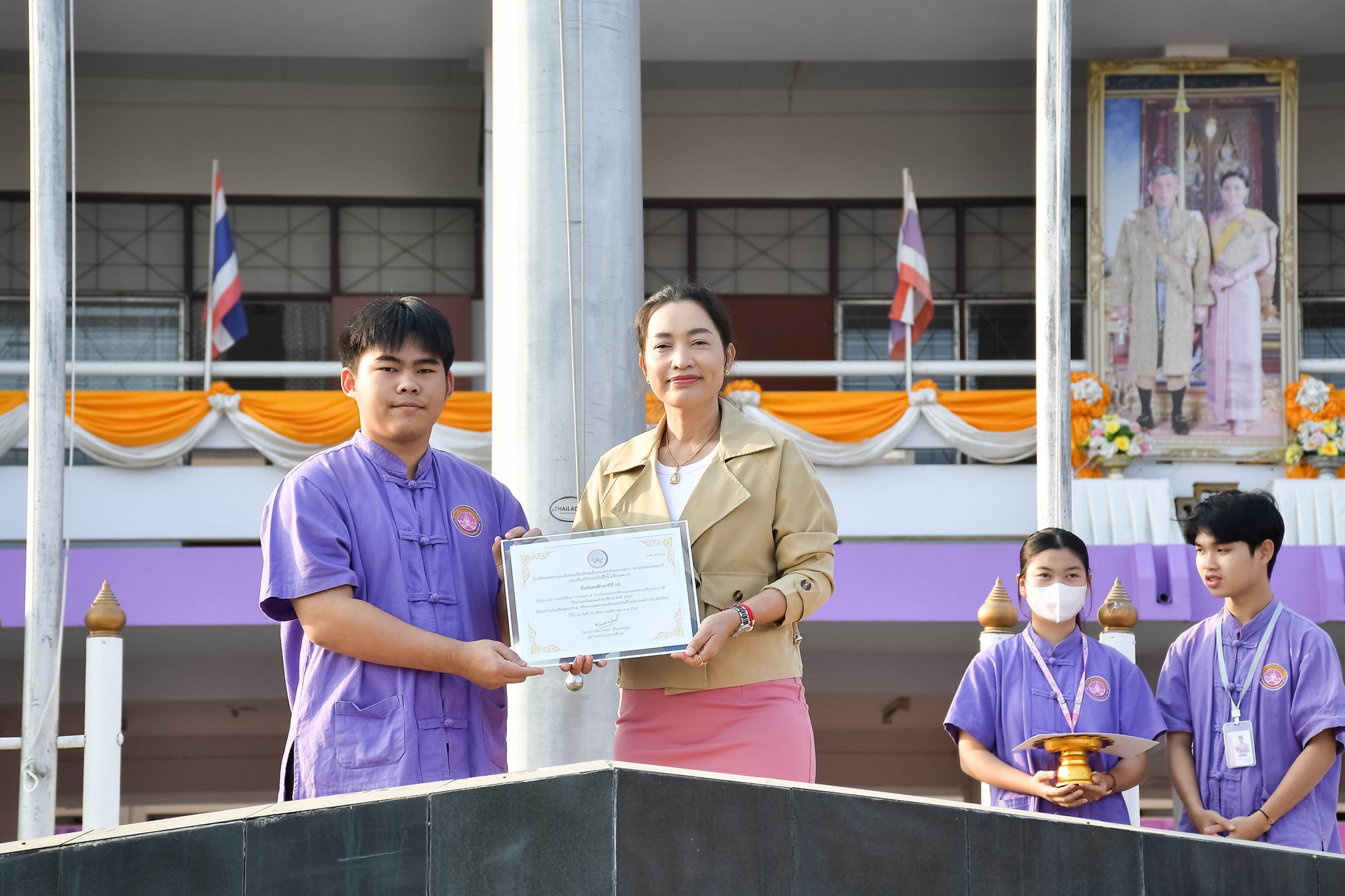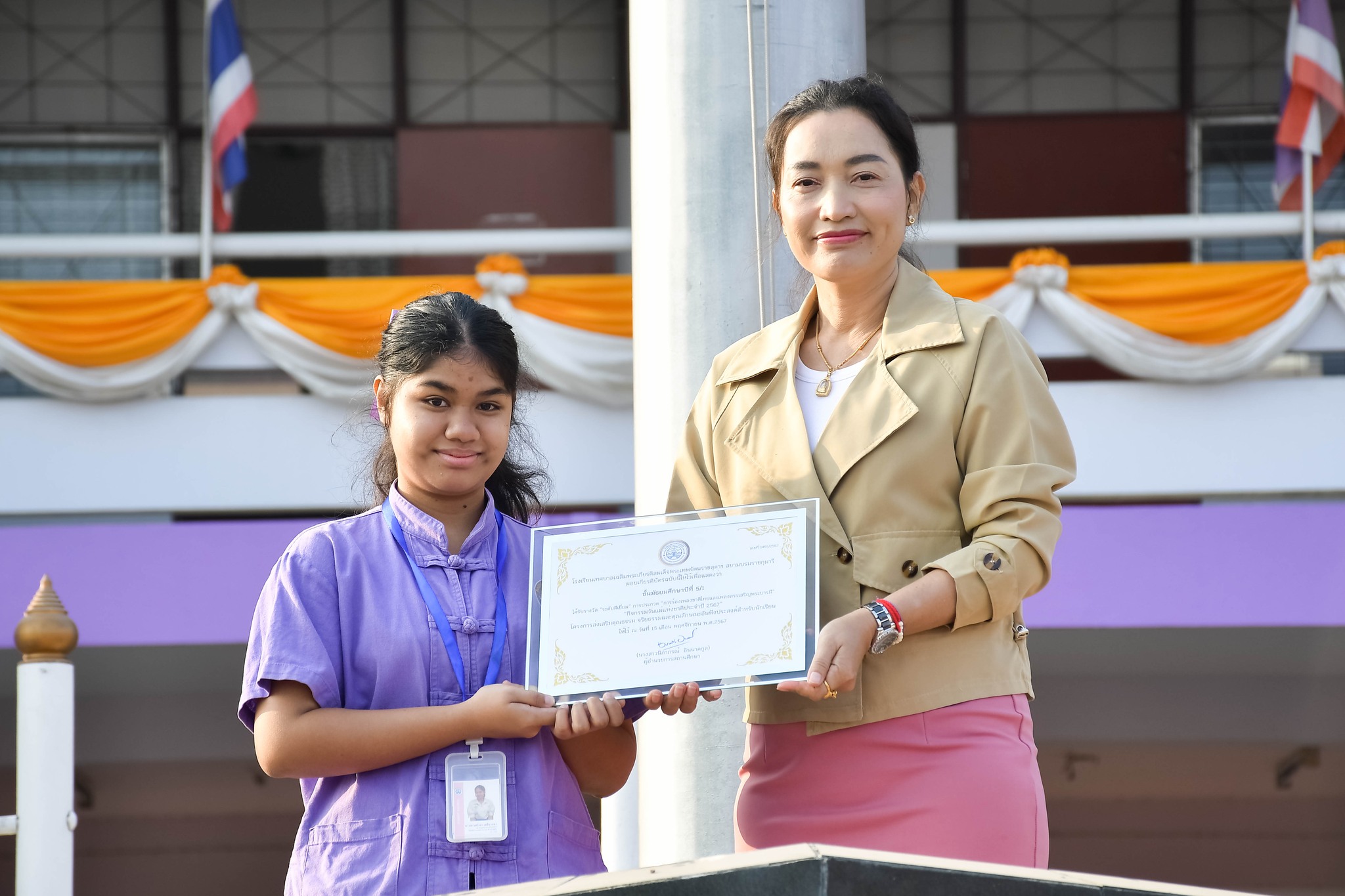 นางสาวนิภาภรณ์ อินนาคกูล ผู้อำนวยการสถานศึกษา โรงเรียนเทศบาลเฉลิมพระเกียรติสมเด็จพระเทพรัตนราชสุดา ฯ สยามบรมราชกุมารี มอบรางวัลให้กับตัวแทนห้องเรียนนักเรียนในผลการตัดสินการประกวด “การร้องเพลงชาติไทยและเพลงสรรเสริญพระบารมี” “กิจกรรมวันแม่แห่งชาติประจำปี 2567” โครงการส่งเสริมคุณธรรม จริยธรรมและคุณลักษณะอันพึงประสงค์สำหรับนักเรียน ณ โรงเรียนเทศบาลเฉลิมพระเกียรติสมเด็จพระเทพรัตนราชสุดา ฯ สยามบรมราชกุมารี