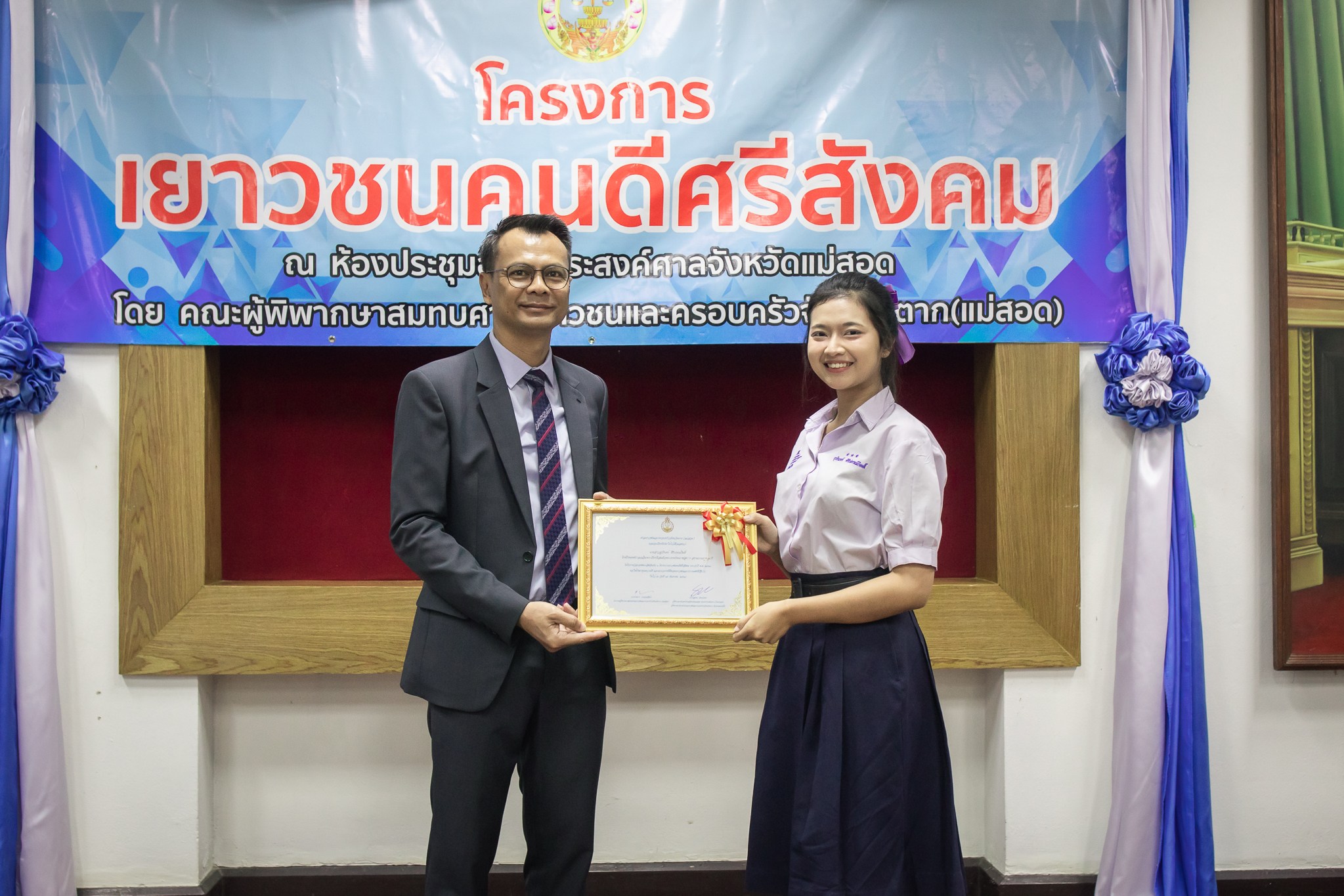 ศาลเยาวชนและครอบครัวจังหวัดตาก (แม่สอด) ขอแสดงความยินดีกับเยาวชนทุกท่านที่ได้รับรางวัล และหวังเป็นอย่างยิ่งว่าโครงการนี้จะเป็นแรงบันดาลใจให้เยาวชนทั่วทั้งจังหวัดร่วมกันสร้างสรรค์สังคมที่มีคุณธรรม จริยธรรม และเป็นรากฐานสำคัญของการพัฒนาประเทศชาติต่อไป