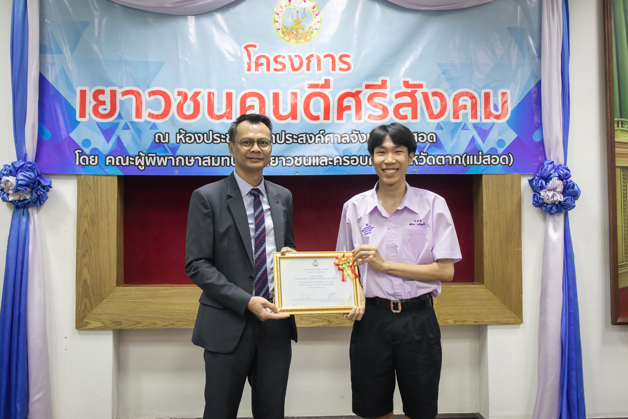 ตาก, แม่สอด ศาลเยาวชนและครอบครัวจังหวัดตาก (แม่สอด) ได้จัดพิธีมอบเกียรติบัตรและรางวัลในโครงการ "เยาวชนคนดีศรีสังคมจังหวัดตาก (แม่สอด) ประจำปี พ.ศ. 2568" โดยมีนายสุเทพ จันทร์เทศ ผู้พิพากษาหัวหน้าศาลจังหวัดแม่สอด เป็นประธานในพิธี พร้อมด้วยท่านประธานที่ปรึกษากิตติมศักดิ์, ประธานผู้พิพากษาสมทบ, คณะผู้พิพากษาสมทบ, ผู้อำนวยการ, ผู้บริหารโรงเรียน, คณะครูทุกท่าน และเยาวชนผู้เข้าร่วมโครงการทุกคน โดยมีเยาวชนผู้ผ่านการคัดเลือกเข้ารับรางวัลรวมทั้งสิ้น 22 คน