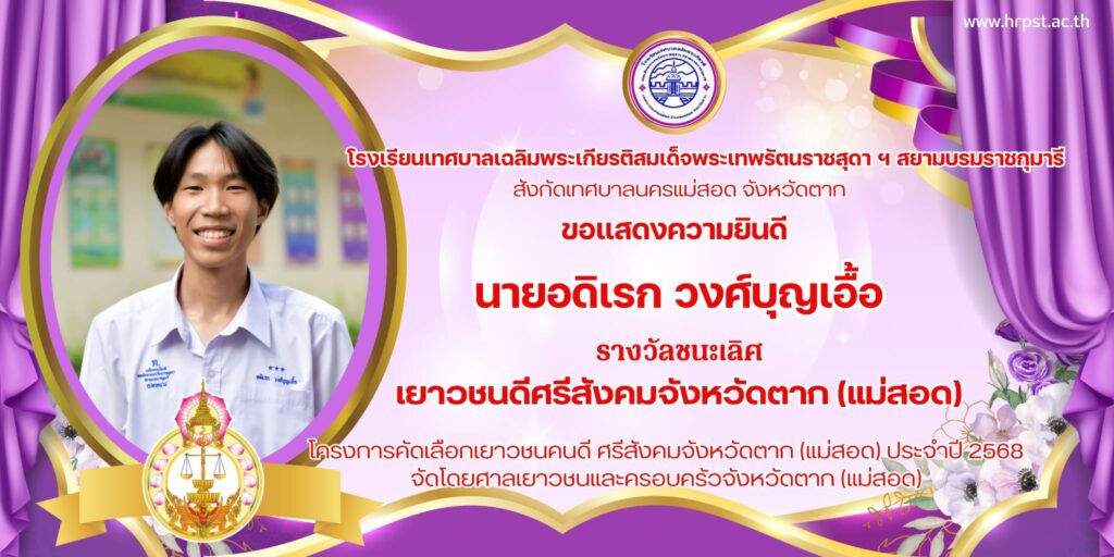 ประชาสัมพันธ์เยาวชนคนดีศรีสังคมจังหวัดตาก (แม่สอด) ประจำปี พ.ศ.2568 ได้รับการประกาศชื่อ admin / 26/08/2025 เยาวชนคนดีศรีสังคมจั