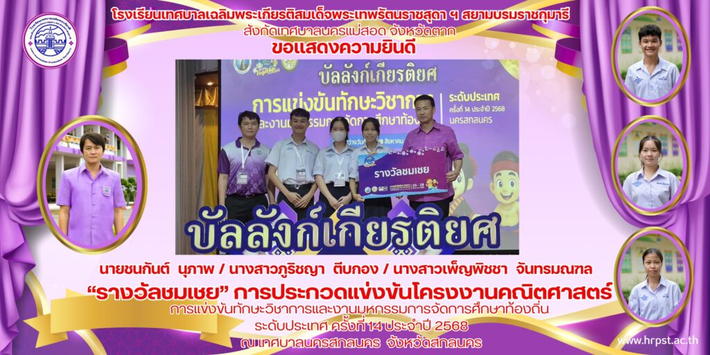 ประชาสัมพันธ์ลำดับที่ 4 “รางวัลชมเชย” การประกวดแข่งขันโครงงานคณิตศาสตร์ นายชนกันต์ นุภาพ / นางสาวภูริชญา ตีบกอง / นางสาวเพ็ญพิชชา จันทรมณฑล ครูผู้ฝึกสอน/ควบคุม นายดุสิต เทพอาวุธ admin / 28/08/2025 ลำดับที่ 4 “รางวัลชม
