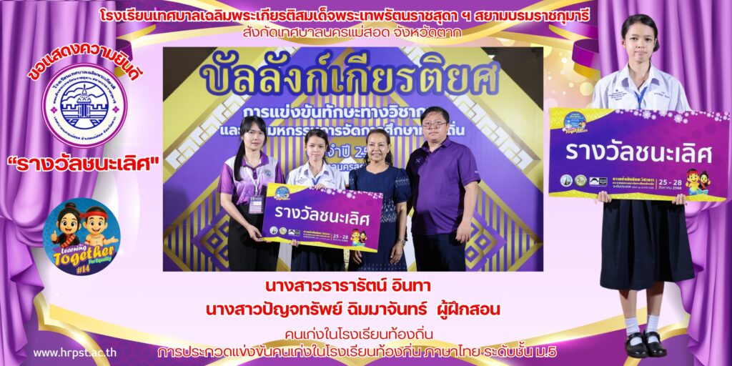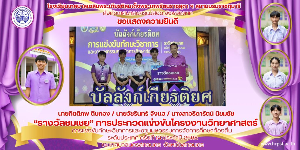 ประชาสัมพันธ์ลำดับที่ 4 “รางวัลชมเชย” การประกวดแข่งขันโครงงานวิทยาศาสตร์ นายกิตติภพ ตีบกอง / นายวัชรินทร์ จังแฮ / นางสาวธิดารัตน์ นิยมชัย ครูผู้ฝึกสอน/ควบคุม นายพงศกร บุญนายืน admin / 28/08/2025 ลำดับที่ 4 “รางวัลชม